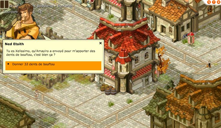 Il faut aller tuer autant de bouftous que vous avez de dents (32 donc si vous avez pas manger trop de bonbons), les dents sont en objets de quetes, 1 bouftou tué = 1 dent, attention il faut le nombre pile de dents !! |