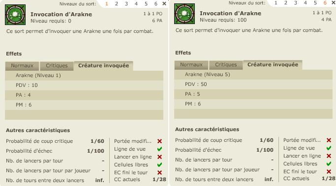 C'est un sort qui permet d'invoquer une arakné, elle a plus ou moins de vitalité suivant le level du sort et de votre personnage. Vous avez de base 1 chance sur 60 de faire un Coup Critique mais si vous en reussissez un vous allez invoquer une arkné majeur, veritable monstre enlevant PA, poussant et tapant assez fort. Enfin cela reste un petit sort bonus, inutile de le monter si vous n'etes pas trés haut level et avec des points en trop. Pour obtenir ce sort il y a 2 méthodes différentes : |