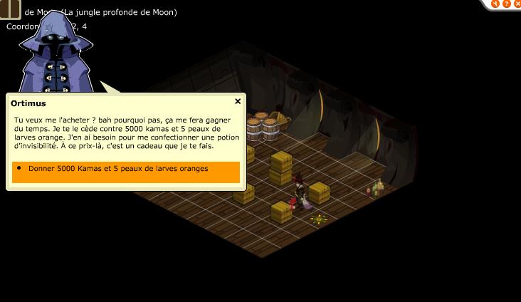 Avant tout, il faudra au moins etre level 20 pour avoir casque et aile moon puis atterir sur l'ile grace au canon en 11/10. Une fois sur l'ile, allez voir Kib en 35/11. Prenez 5 peaux de larves orange avec vous sinon vous allez etre decu. |