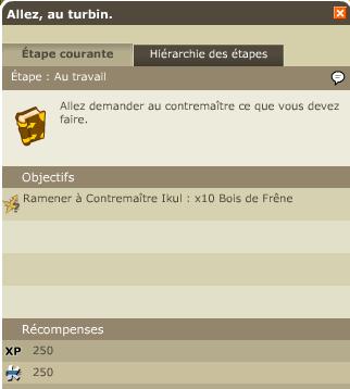 Appoertez lui selon votre métier : - 10 Fleurs de lin (alchimiste) - 10 Blés (paysan) - 2 goujons (pêcheur) - 10 Frêne (bûcheron) |
